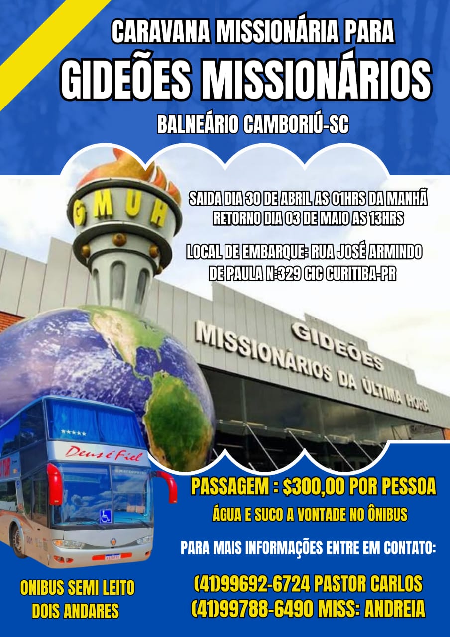 Caravana missionária Caravana de Curitiba - PR Hotel e por conta de cada um ou dormir no ônibus oferecendo água sucos café da manhã saindo fespera do feriado dia 1 do trabalhador na quinta 00 retorno no domingo saindo de Camboriú as 13 horas Organizador(a) da Caravana Psstor Carlos Mira Entre em contato 41996926724 41996926724 Email
