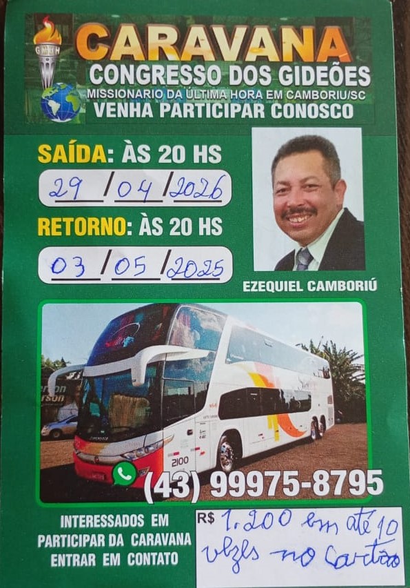Caravana para Glória de Deus Caravana de Londrina - PR saída 29/04 de Londrina e região Retorno:03/05 Incluso: viagem, estadia em pousada em Balneário Camboriú, café da manhã e almoço Organizador(a) da Caravana Ezequiel Amancio Entre em contato 43999758795 43999758795 Email