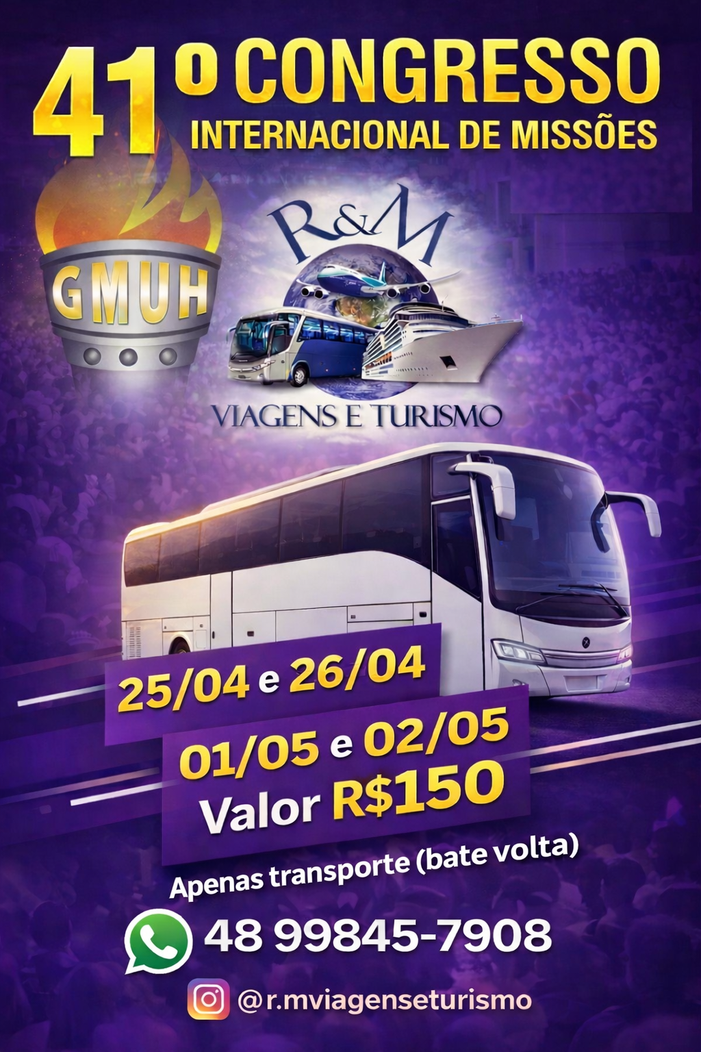 Excursão Gideões Missionários 2026 Caravana de TUBARÃO - SC Excursões Bate e Volta Datas : 25/04 , 26/04 , 01/05 e 02/05 Saindo de Ararangua pegando nas demais cidades pela BR101. R$150 o Transporte . Organizador(a) da Caravana Miriam Mattos Entre em contato 48998457908 48998457908 Email